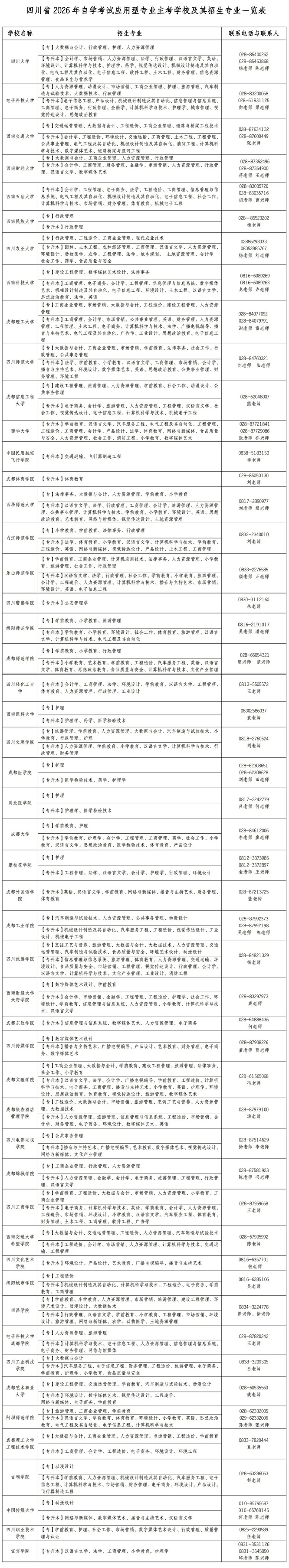 自学考试是我国高等教育的重要组成部分,是个人自学、社会助学和国家考试相结合的高等教育形式。为促进自学考试持续健康发展,省招考委、教育厅同意四川大学等50所高等学校为我省2026年高等教育自学考试应用型专业的主考学校,并开展自学考试助学工作,现将有关高等学校、主考专业及相关情况通告如下: