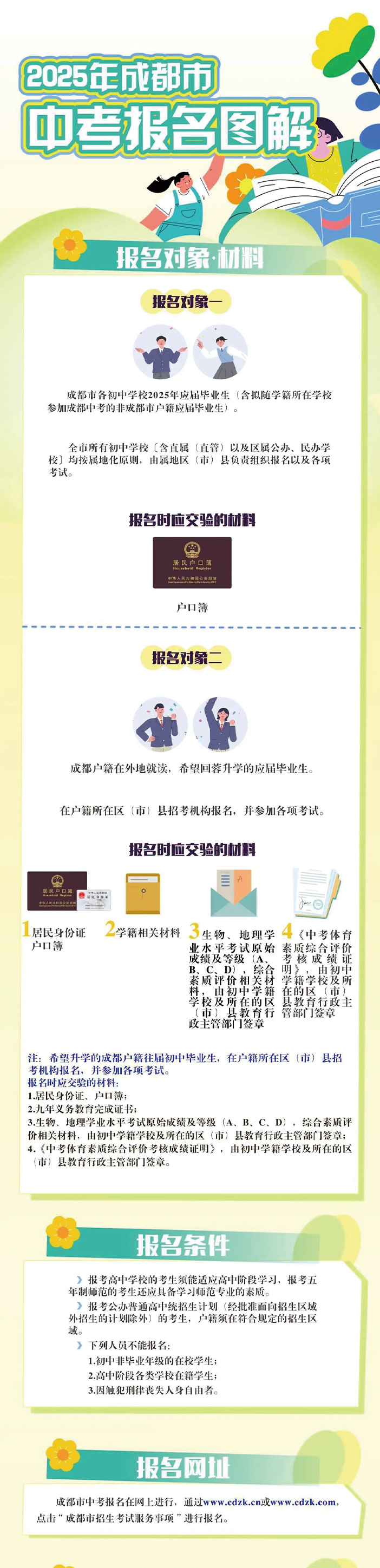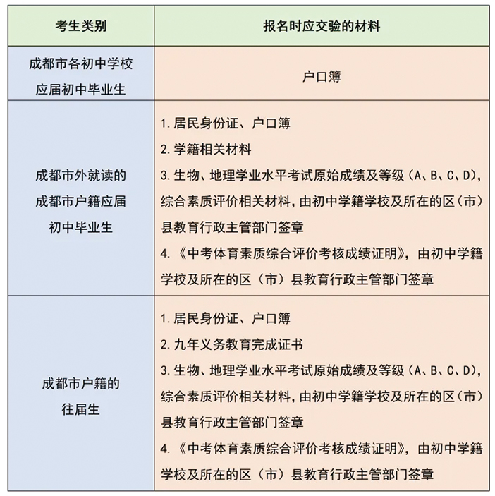 考生登录报名网站,注册后(已经注册的,不需要再注册)进行中考报名信息(含考生个人电子照片)采集,完成地理和生物成绩确认,并按规定交验材料。同时,学籍、户籍不在同一招生区域的成都市户籍考生要完成选择、确定升学区域(学籍所在招生区域或户籍所在招生区域二选一)。
