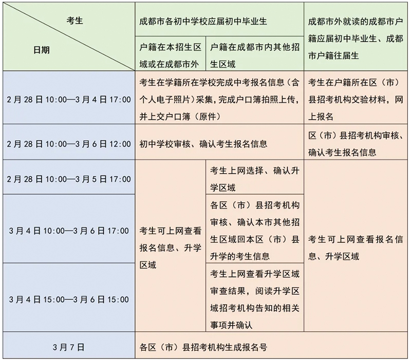 在成都市各初中学校就读、根据政策可享受本地户籍待遇的非本地户籍考生,在学籍所在学校报名。报名结束后,填写《成都市中考非本地户籍考生享受本地户籍待遇申请表》,并提供相关证明材料,4月17日前交学校,学校汇总后交区(市)县招考机构审查(复核)、处理,4月17日以后不受理。4月26日前,各区(市)县招考机构完成审查(复核)、处理工作,将数据报市教育考试院。