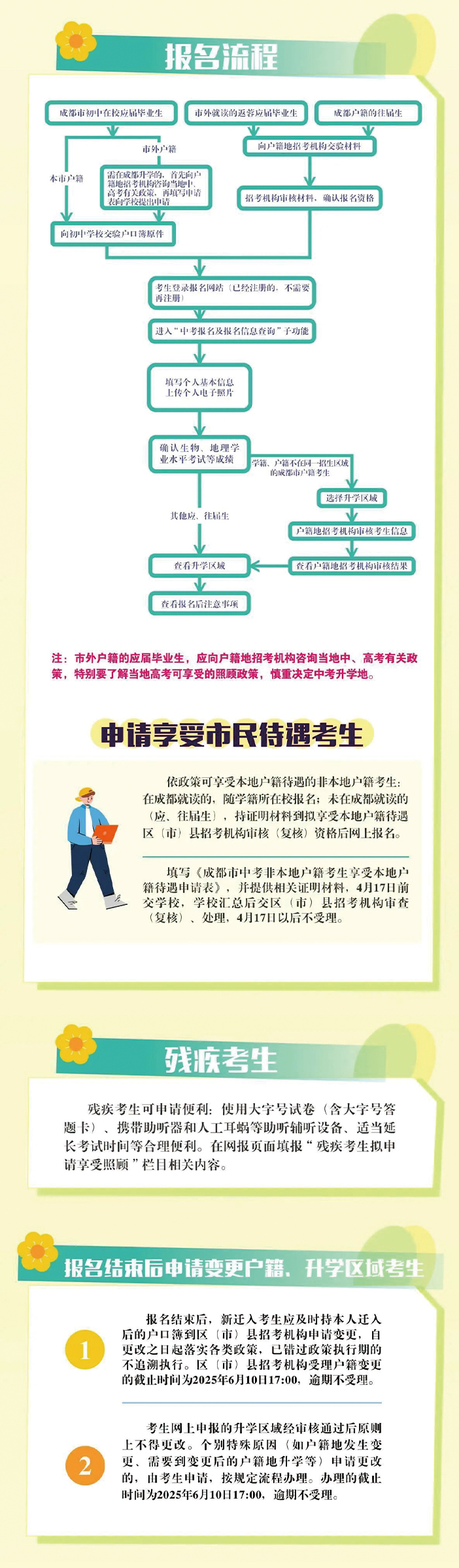 报名结束后户口迁入本招生区域的非本地户籍考生,应及时持本人迁入后的户口簿到区(市)县招考机构申请更改报名信息(包括户籍、考生类别等),并自更改之日起落实各类招生政策(已错过政策执行期的不追溯执行),各区(市)县招考机构受理户籍更改的截止时间为2025年6月10日17:00,逾期不受理。