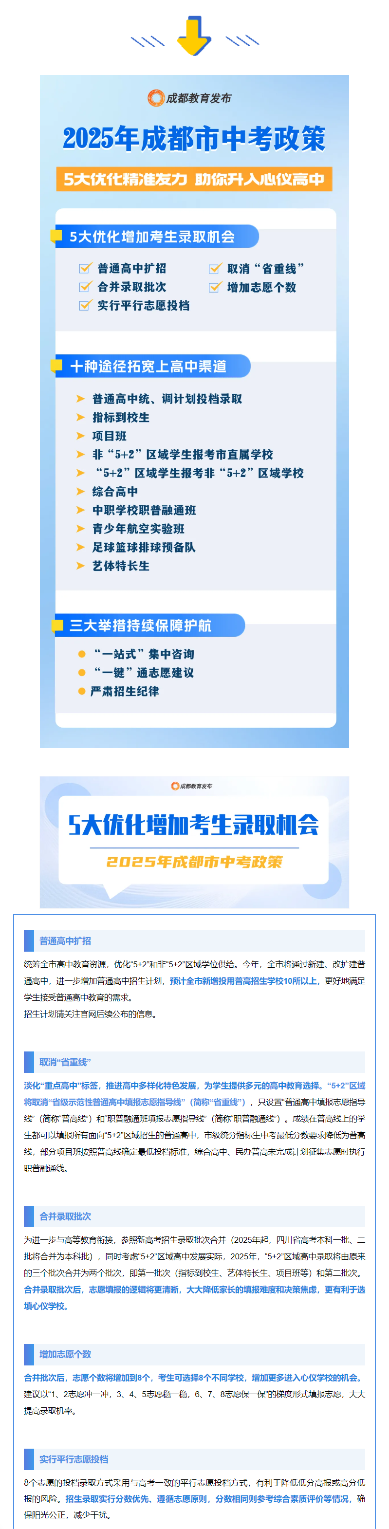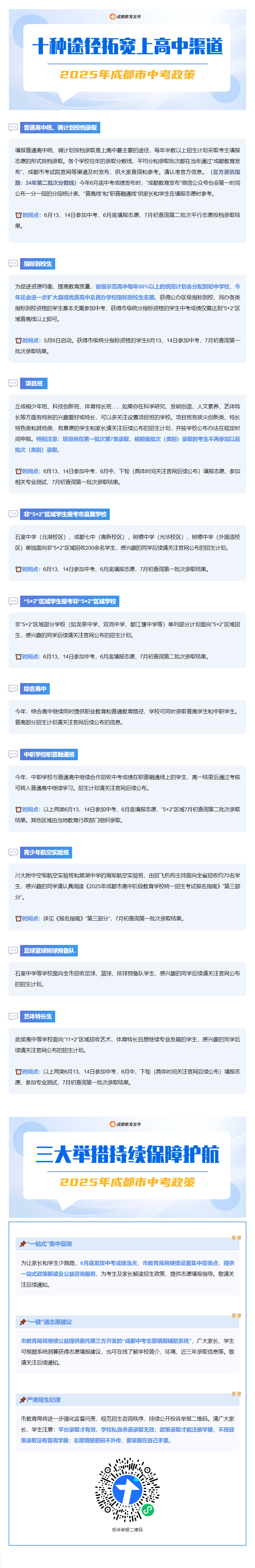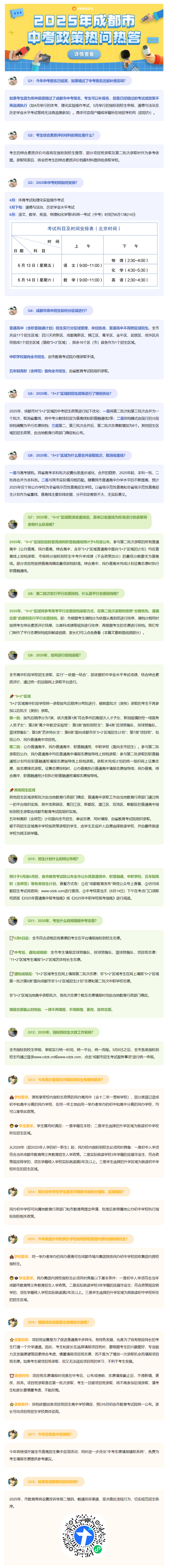 近日,成都市招考委、成都市教育局印发《2025年成都市高中阶段学校统一招生考试工作实施规定》。今年中招政策聚焦5大优化,进一步推进育人方式变革,促进普通高中多样化有特色发展,为广大学生提供更加多元化的选择,助力考生选填心仪学校,满足学生高中阶段多样化发展需求,助力学生全面而有个性的成长。