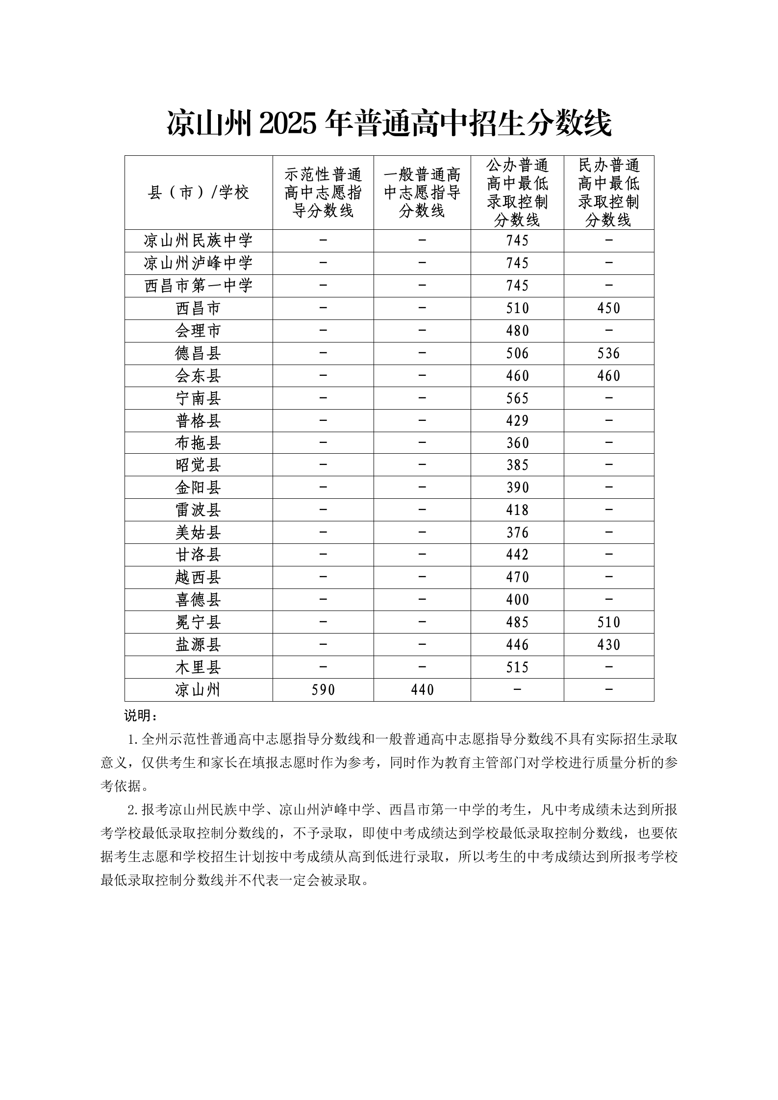 凉山州教育和体育局 关于公布凉山州2025年普通高中招生 分数线的通知